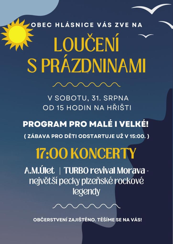 Obec Hlásnice Vás srdečně zve na tradiční akci rozloučení s prázdninami v sobotu 31.srpna od 15:00 hodin v zahradě KD. Občerstvení zajištěno. Kapely vystoupí od 17.00 hodin.